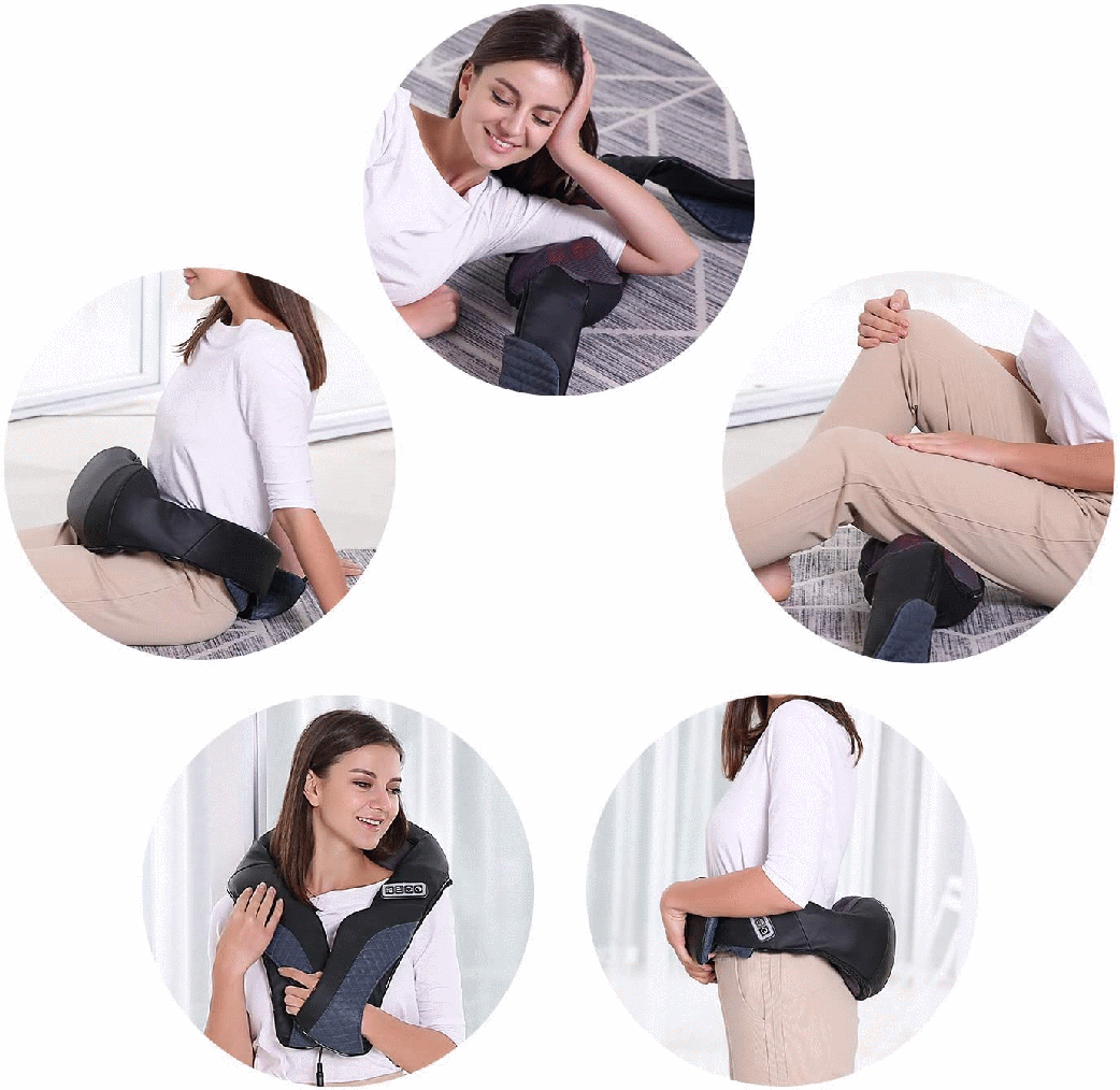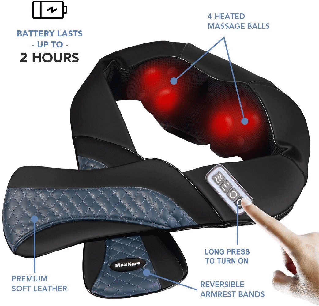 Wie bei andere Massagegeräten, hat auch dieses drei verschiedene Intensitätsstufen, verfügt über eine begrenzt nützliche Wärmefunktion und die Massagerichtung kann automatisch und auch manuell reguliert werden. Die Massage ist kräftig und gibt einem das Gefühl, als ob man von einer anderen Person massiert wird. Durch den integrierte Akku kannst Du dich ca. 120 Minuten bequem auf die Couch oder den Sessel legen, ohne auf ein lästiges Kabel zu achten. Natürlich kannst Du es auch mit dem Kabel nutzen, doch mit seiner länge von ca. 170 cm, mußt Du dich immer in der Nähe einer Steckdose massieren lassen. Leider ist keine Tasche dabei, mit dem man das Gerät zum Fahrzeug oder ins Büro transportieren kann. Dem Gerät ist ein KFZ-Netzstecker beigefügt, sodaß Ihr euch bequem, beim Autofahren massieren lassen könnt. Das Massagegeräte ist in einer ergonomischen U-Form aufgebaut. Während der Massageteil des Gerätes im Nacken liegt, hängen links und rechts zwei Schlaufen. Durch diese beiden Schlaufen können die Arme gesteckt werden, wenn der Nacken massiert wird. Durch das atmungsaktive Mesh können sich die Massageknoten flexibel bewegen. Das PU-Leder kann leicht mit einem Tuch abgewischt und gereinigt werden. Die Armschlaufen sind zirka 40 cm lang. Durch die Handschlaufen kann sich der Druck und die Intensität der Massage regulieren lassen. Die über infrarot funktionierende Wärmefunktion des Nackenmassagegerätes kann optional eingeschaltet werden. Wenn die Wärmefunktion eingeschaltet ist, leuchten die Massagerollen rot. Um diese Funktion wirkungsvoll nutzen zu können, sollte man es vermeiden, unter dem Massagegerät, Kleidung zu tragen, da sonst die Wärmefunktion, nur bedingt spürbar ist